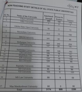 ସେହିପରି, ୧୭ଟି ବିଶ୍ୱବିଦ୍ୟାଳୟରେ ୨୨୮୬ଟି ଅଣଶିକ୍ଷକ ପଦବୀ ଖାଲି ପଡ଼ିଛି ବୋଲି ଉଚ୍ଚଶିକ୍ଷା ମନ୍ତ୍ରୀ ସୂର୍ଯ୍ୟବଂଶୀ ସୂରଜ ଗୃହରେ ପଚରାଯାଇଥିବା ପ୍ରଶ୍ନର ଲିଖିତ ଉତ୍ତରରେ ଉଲ୍ଲେଖ କରିଛନ୍ତି।