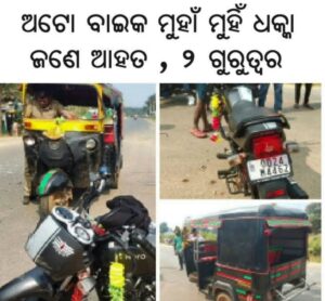 ଅଟୋ ବାଇକ ମୁହ।ମୁହିଁ ଧକ୍କ। ଜଣେ ଆହତ ୨ଜଣ ଗୁରୁତର