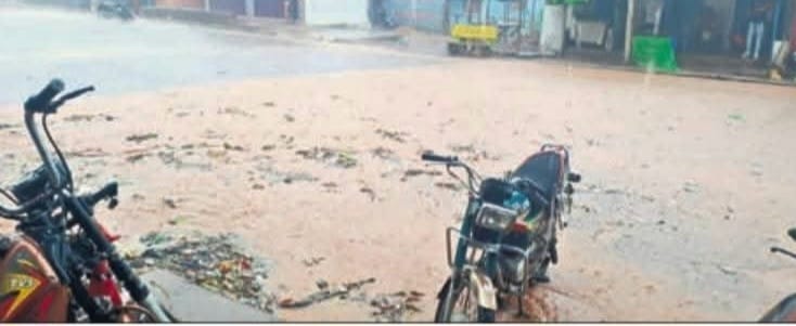 ରାସ୍ତାରେ ବର୍ଷା ପାଣି ଓ ଆବର୍ଜନା ଜମିରହିଛି।