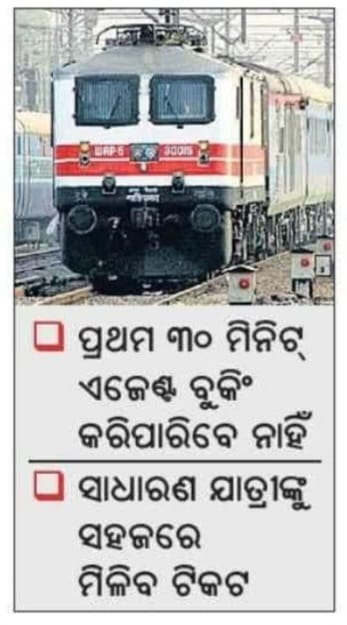 ଟିକଟ ବୁକି ବୁକିଂ ସୁଯୋଗ କେବଳ ପ୍ରକୃତ ଯାତ୍ରୀଙ୍କୁ ମି ମିଳୁ । ଆଧାର ପ୍ରମ ପ୍ରମାଣନ ଦ୍ବାରା ଏହା ସୁନିଶ୍ଚିତ ହେବ ଯେ, ଟିକଟ ଉକ୍ତ ବ୍ୟକ୍ତି ବୁକ୍ କରୁଛନ୍ତି, ଯାହାଙ୍କ ଆ ନମ୍ବର ପଞ୍ଜୀକୃ ପଞ୍ଜୀକୃତ ଅଛି। ପ୍ରଥମ ୩୦ ମିନିଟ୍ ଆଧାର ଯାଏ ଏସି ଏବଂ ନନ୍-ଏସି ଉଭୟ ବର୍ଗ ପାଇଁ ଏଜେଣ୍ଟ୍‌ଙ୍କୁ ଟିକଟ ବୁକିଂ ଅନୁମତି ମିଳିବ ନାହିଁ ।