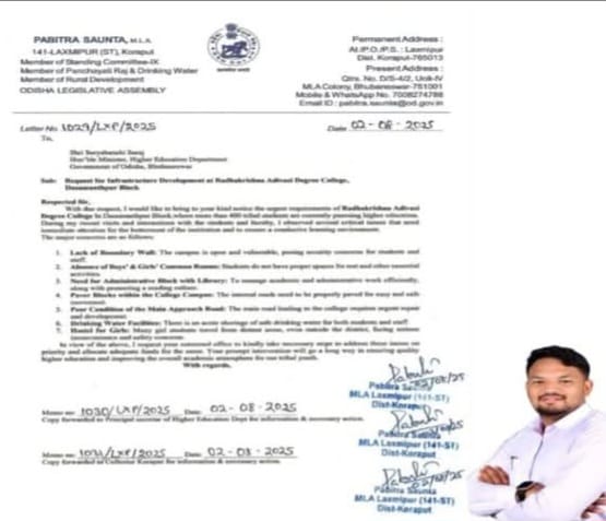 ଦଶମନ୍ତପୁର ଡିଗ୍ରୀ କଲେଜର ଉନ୍ନତିକରଣ ପ।ଇ ବିଧାୟକ ଉଚ୍ଚ ଶିକ୍ଷାମନ୍ତ୍ରୀଙ୍କୁ ଲେଖିଲେ ଚିଠି