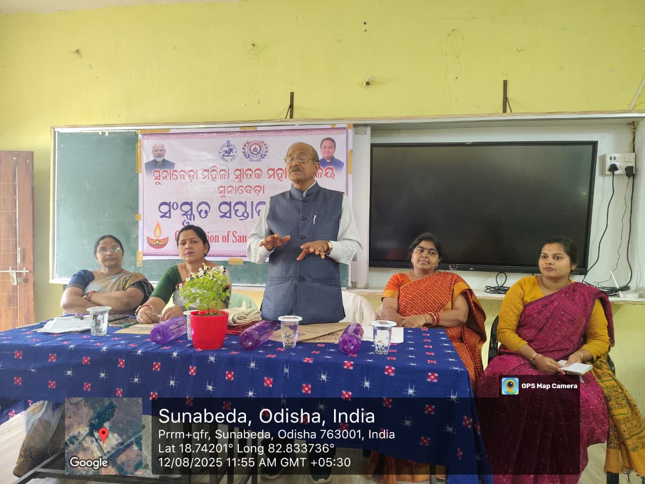 ସୁନାବେଡ଼ା, ୧୨/୦୮: ସୁନାବେଡ଼ା ମହିଳା ସ୍ନାତକ ମହାବିଦ୍ୟାଳୟ ଠାରେ ଓଡ଼ିଶା ଉଚ୍ଚଶିକ୍ଷା ବିଭାଗର ନିର୍ଦ୍ଦେଶ କ୍ରମେ ଆଜି ସଂସ୍କୃତ ସପ୍ତାହ ପାଳନ କରାଯାଇଛି | ଓଡ଼ିଶା କେନ୍ଦ୍ରୀୟ ବିଶ୍ୱବିଦ୍ୟାଳୟର କୂଳପତି ଡ଼କ୍ଟର ଏନ.ସି ପଣ୍ଡା ମୂଖ୍ୟ ଅତିଥି ଭାବେ ଯୋଗ ଦେଇ ଛାତ୍ରୀମାନଙ୍କୁ ସଂସ୍କୃତ ଜ୍ଞାନର ଆବଶ୍ୟକତା ଉପରେ ଆଲୋଚନା କରି, ବିଦେଶୀ ଦେଶଗୁଡ଼ିକ କିପରି ଆମ ସଂସ୍କୃତ ପାଠକୁ ଗ୍ରହଣ କରି ସମସ୍ତ କ୍ଷେତ୍ରରେ ଅଗ୍ରସର ହୋଇପାରୁଛନ୍ତି ବୋଲି ଏହାର ଏକ ତୁଳନାତ୍ମକ ଯକ୍ତି ଦେଇଥିଲେ |